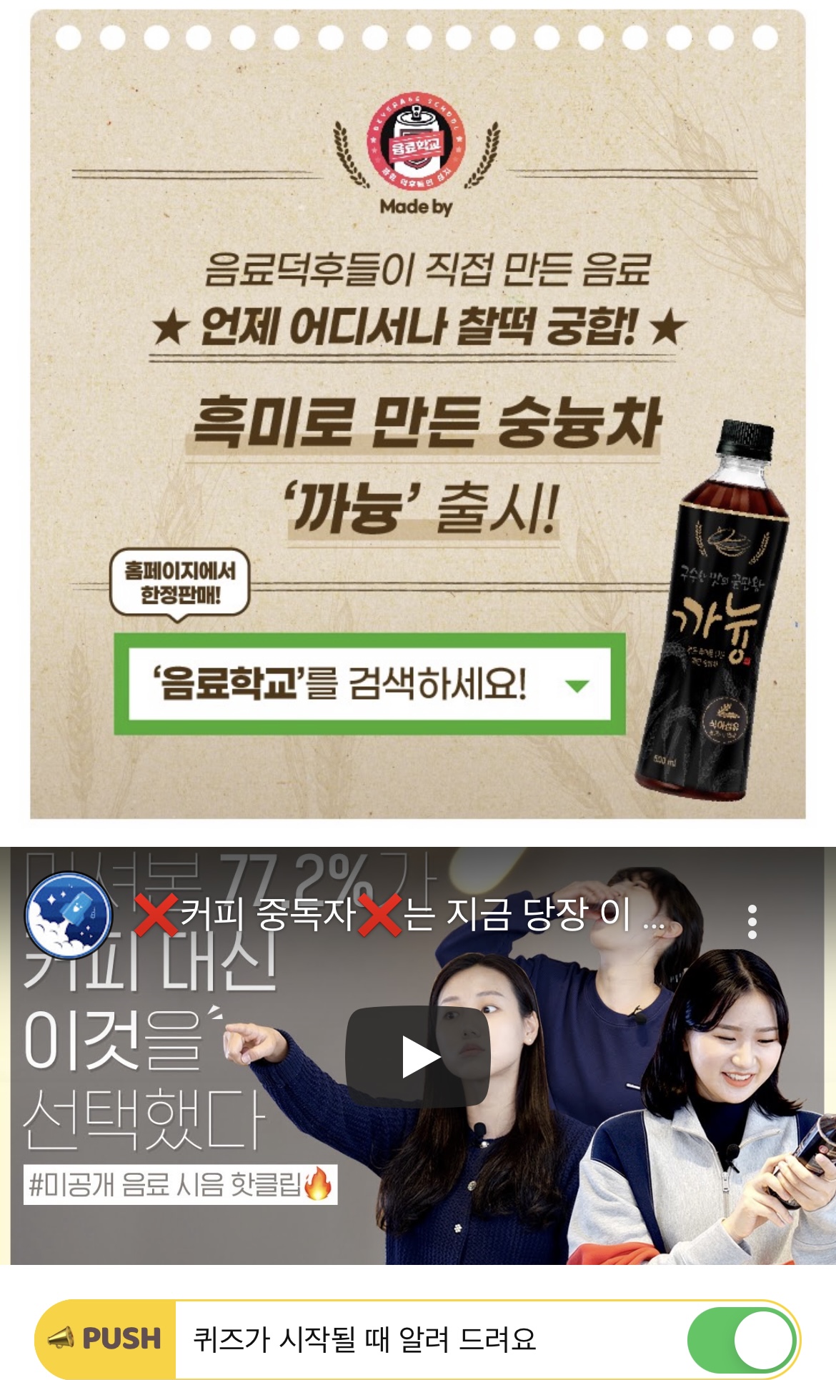 1월 15일까지 한정판매되는 흑미숭늉차 '까늉'의 제품 구성은 총 3가지 패키지로 되어있는데요. 여기서 세트 이름은 "음료 OOO", "음료 덕후", "음료왕" 입니다. OOO에 들어갈 단어는 무엇일까요? (초성힌트 : ㅅㄴㄱ)
