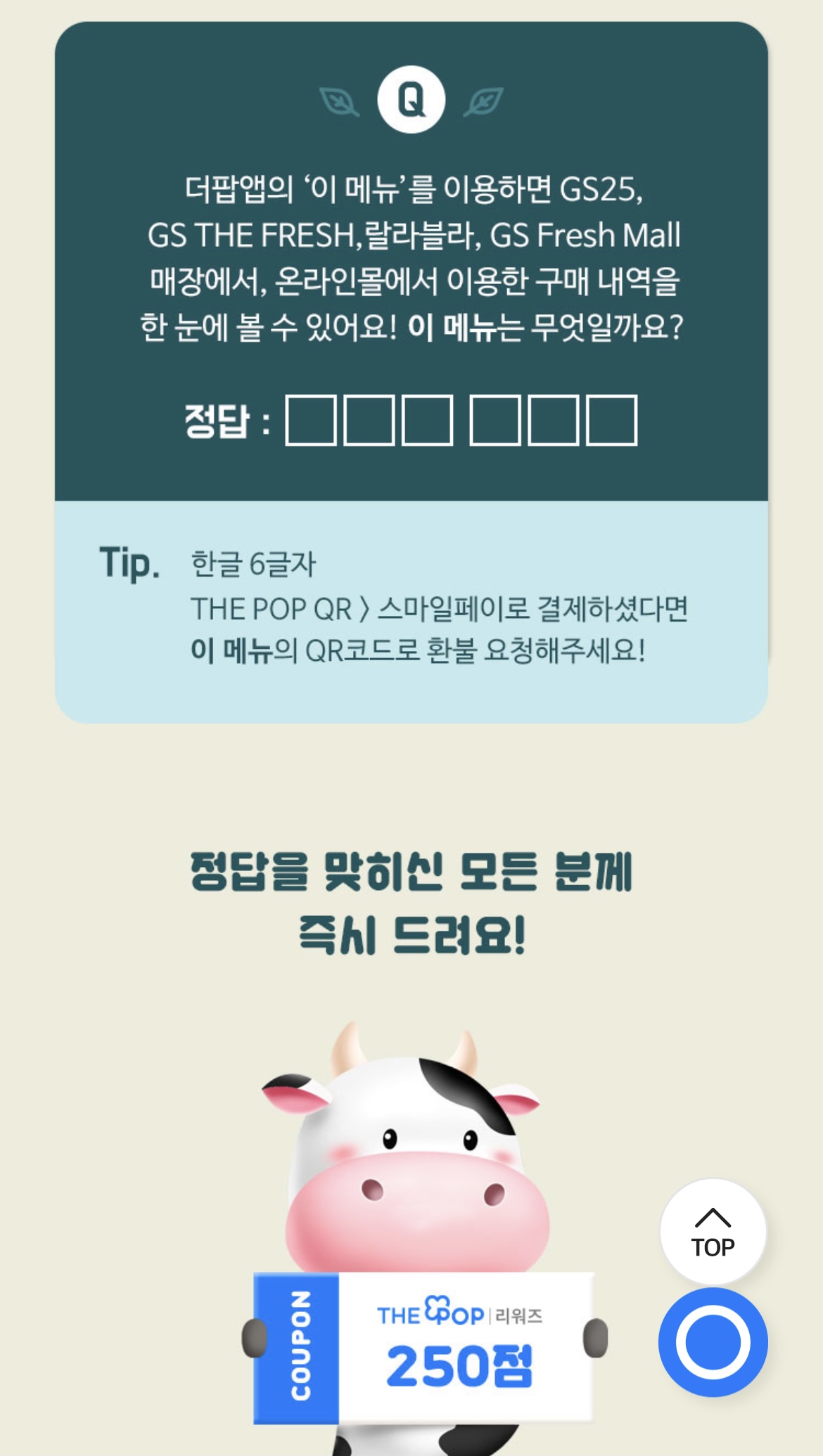 더팝앱의 '이 메뉴'를 이용하면 GS25, GS THE FRESH, 랄라블라, GS Fresh Mall매장에서, 온라인몰에서 이용한 구매 내역을 한 눈에 볼 수 있어요! 이 메뉴는 무엇일까요?