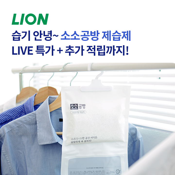 라이온코리아 6월 신제품 소소공방 제습제를 라이브 특가에 구매할 수 있습니다. 행운의 당첨자 1명에겐 비스포크 큐브 냉장고를 드리며, 대표 상품 구매시 N PAY % 추가 적립이 가능합니다.