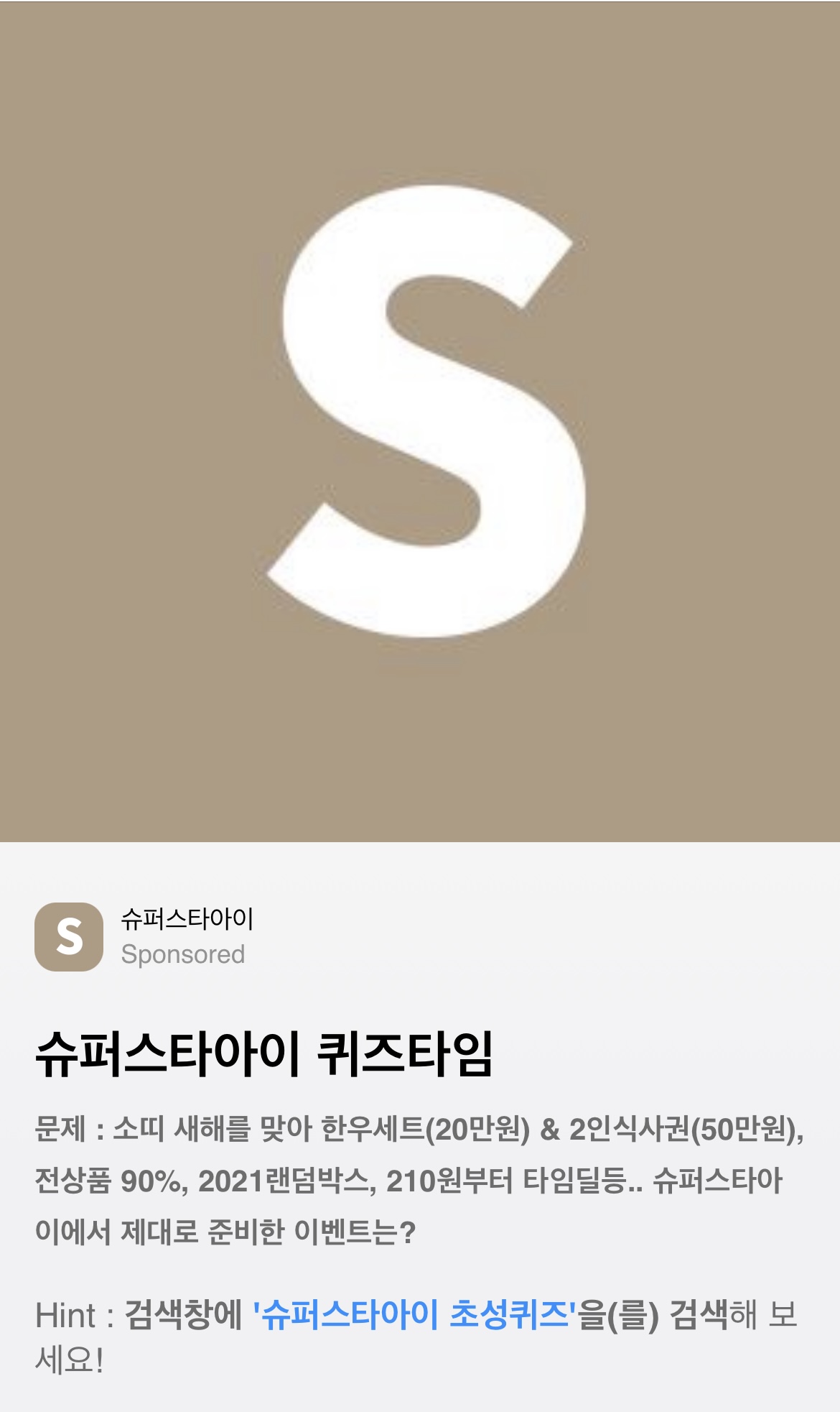 Hint : 검색창에 '슈퍼스타아이 초성퀴즈'을(를) 검색해 보세요