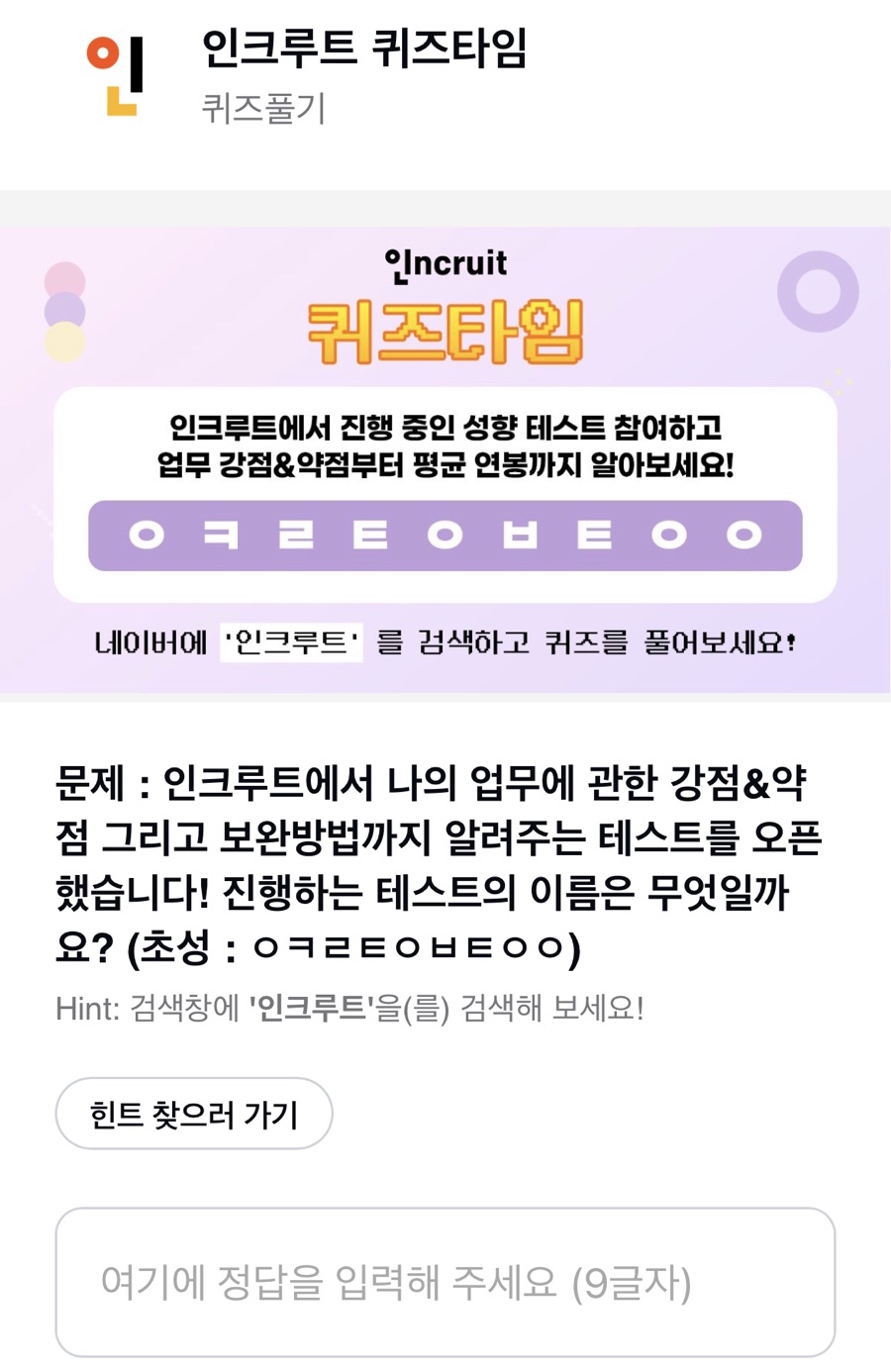 문제 : 인크루트에서 나의 업무에 관한 강점&약점 그리고 보완방법까지 알려주는 테스트를 오픈했습니다! 진행하는 테스트의 이름은 무엇일까요? (초성 : ㅇㅋㄹㅌㅇㅂㅌㅇㅇ)