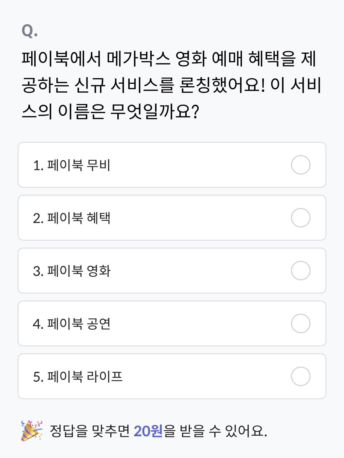페이북에서 메가박스 영화 예매 혜택을 제공하는 신규 서비스를 론칭했어요! 이서비스의 이름은 무엇일까요?