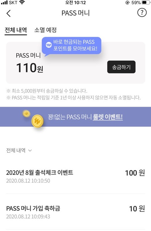 pass 머니 이체 금액은 최소 5000원 이상부터이고 은행 계좌의 명의가 같아야 입금시켜준다.