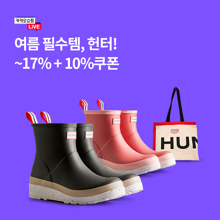 레인부츠 ~17% +쿠폰 문제 : 오늘 카쇼라 X 헌터 라이브에서는 ' 스페클 레인부츠', '오리지날 첼시' 등을 최대 17% 할인가에 판매합니다.