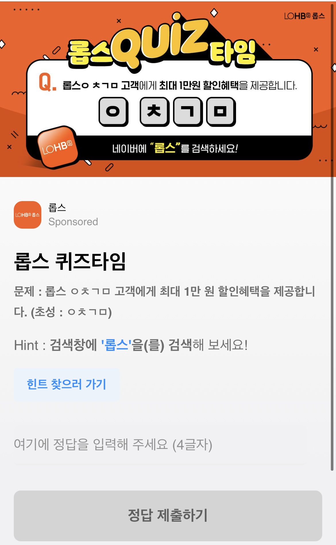 문제 : 롭스 ㅇㅊㄱㅁ 고객에게 최대 1만 원 할인혜택을 제공합니다. (초성 : ㅇㅊㄱㅁ)