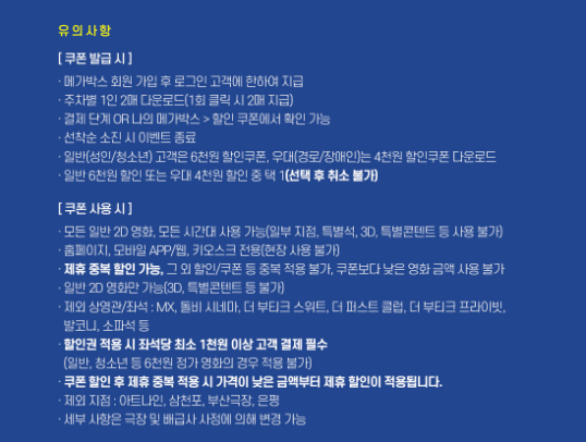 - 영화 및 매점쿠폰은 일부 지점에서 사용이 불가할 수 있으며, 특별관 및 특정 콘텐츠의 관림이 불가할 수 있습니다.