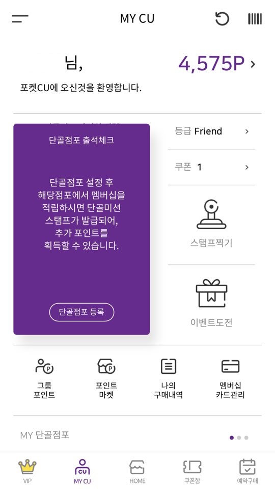 - 자주가는 단골 점포를 포켓 CU에 등록하고 멤버십 적립 미션을 달성하면 추가 포인트가 팡팡!!