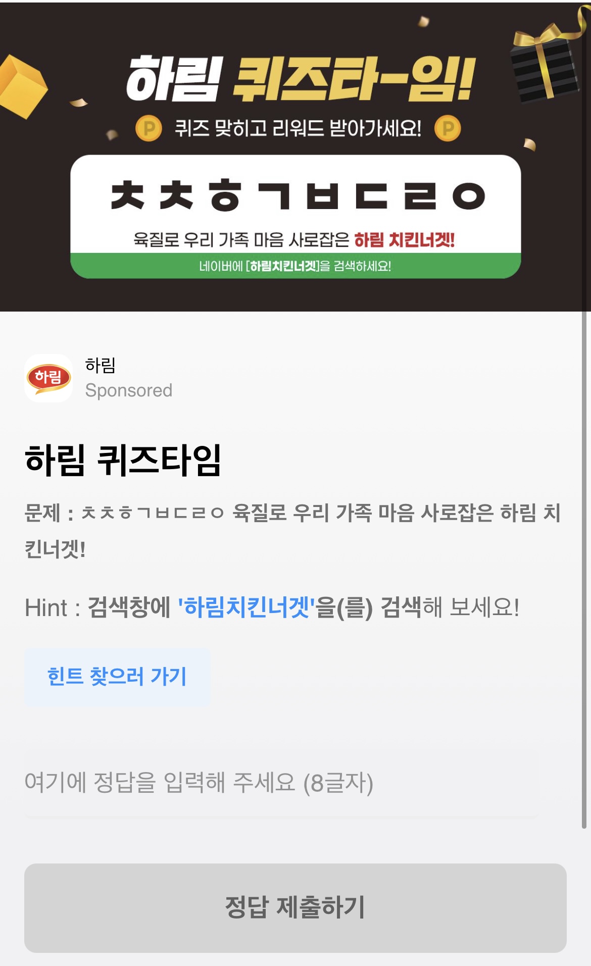 문제 : ㅊㅊㅎㄱㅂㄷㄹㅇ 육질로 우리 가족 마음 사로잡은 하림 치킨너겟!