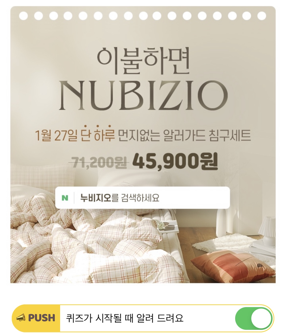 누비지오 BEST 토퍼 중 가장 큰 인기를 차지한 OOOO 10CM 자이언트 순면 토퍼 푸욱- 잠들고 싶다면 오늘이 기회! OOOO에 들어갈 단어는 무엇일까요? (초성힌트 : ㄹㅇㅅㄹ)