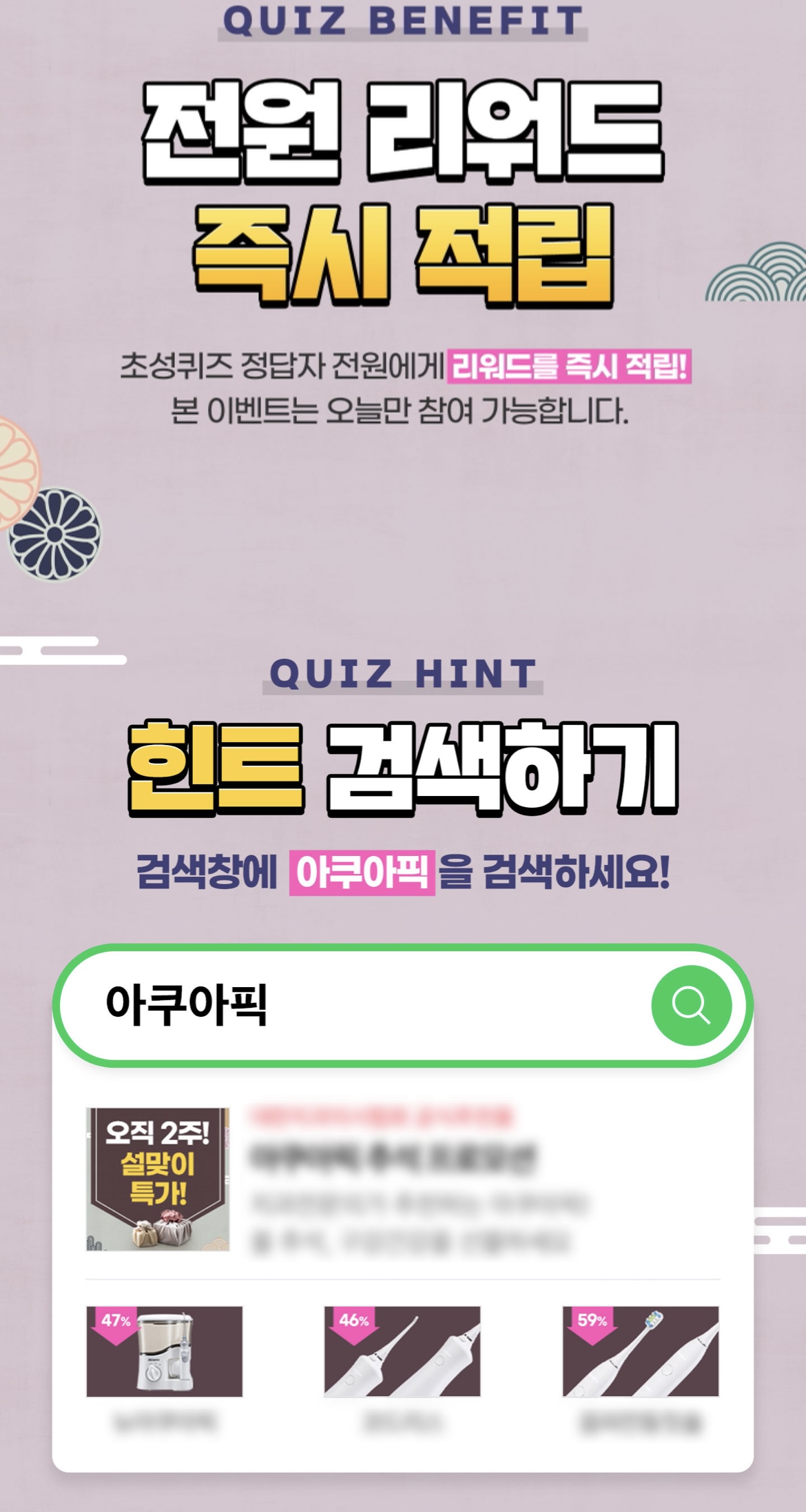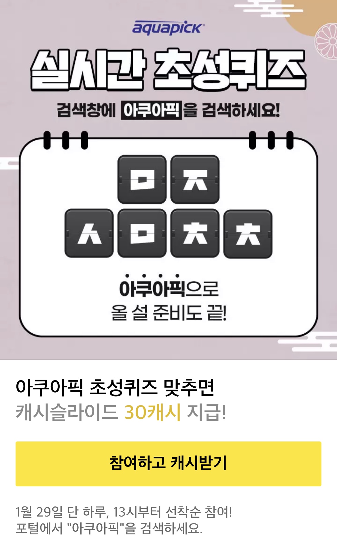 아쿠아픽 초성퀴즈 맞추면 캐시슬라이드 30캐시 지급