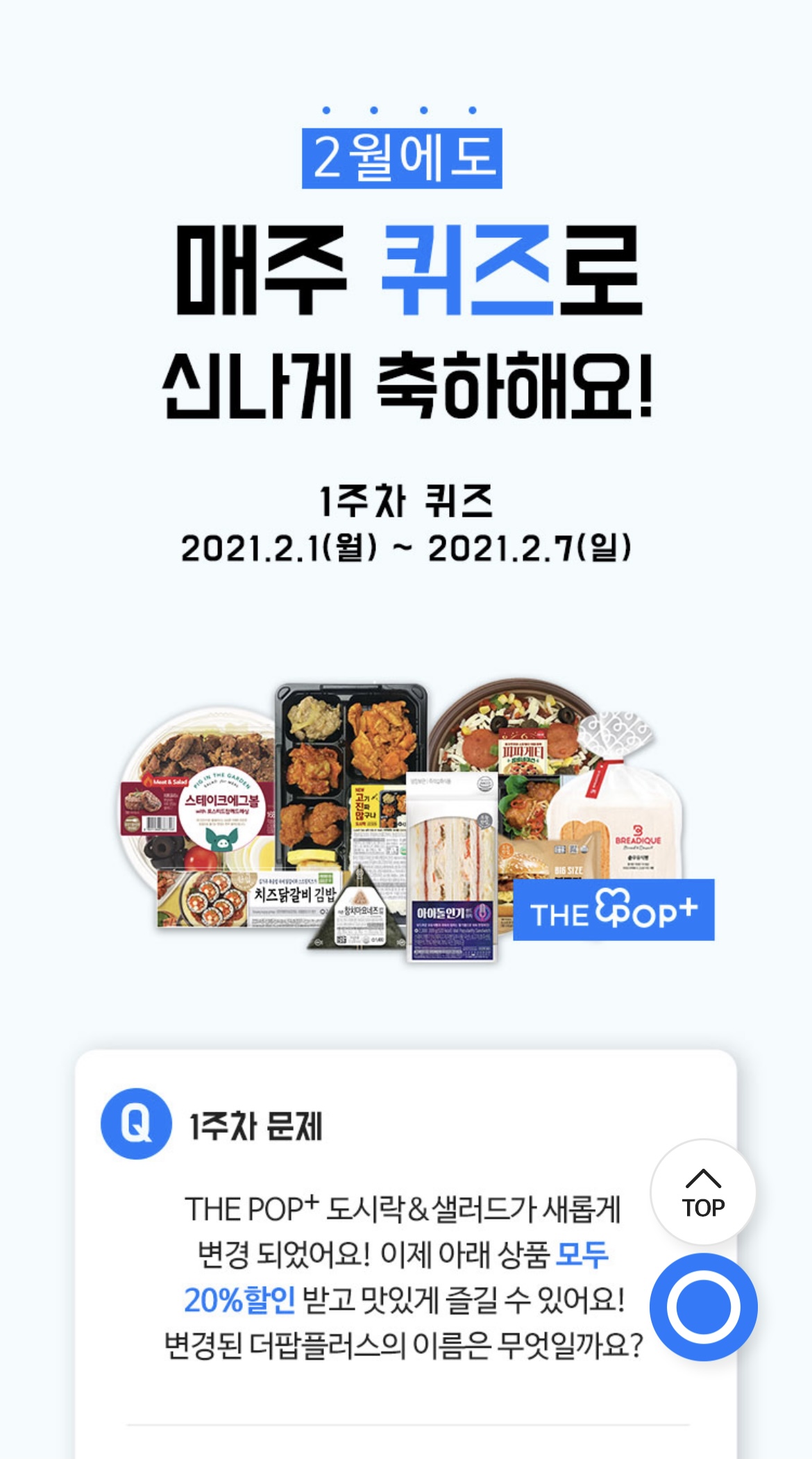 Q : THE POP+ 도시락&샐러드가 새롭게 변경 되었어요! 이제 아래상품 모드 20%할인 받고 맛있게 즐길 수 있어요!