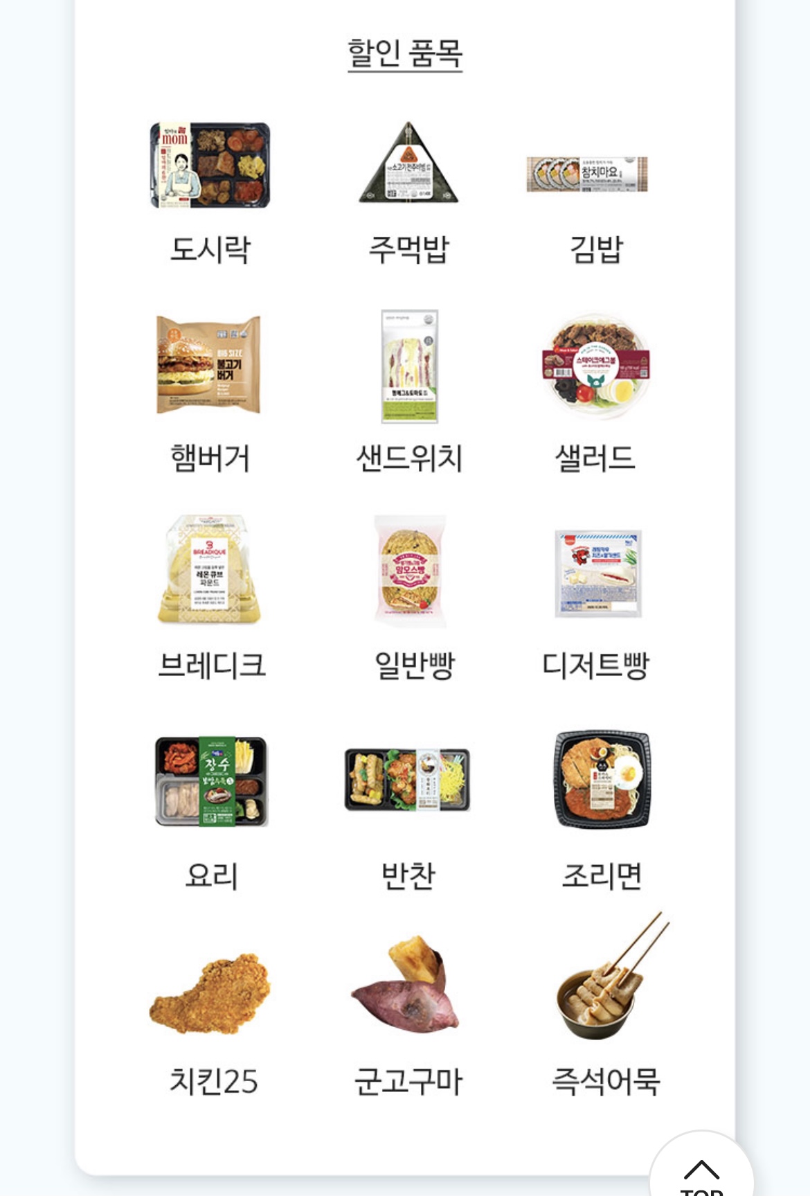할인품목 : 도시락, 주먹밥, 김밥, 햄버거, 샌드위치, 샐러드, 브레디크, 일반빵, 디저트빵, 요리, 반찬, 조리면, 치킨25, 군고구마, 즉석어묵