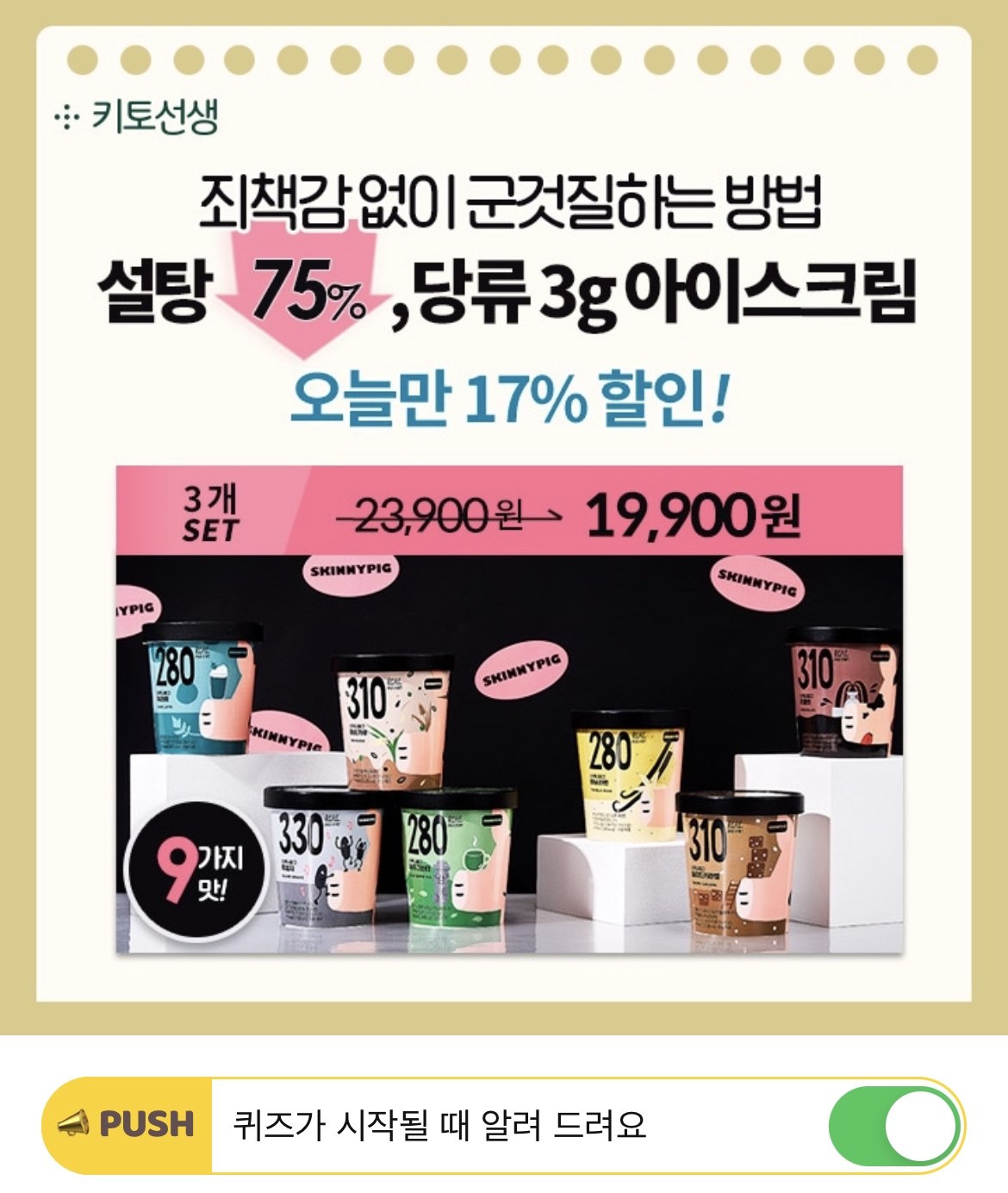당류 과다섭취는 비만의 대표적인 원인입니다. 당뇨, 고혈압 등 다양한 질병을 일으킬 수 있는데요.설탕대신 '0칼로리 천연감미료'로 단맛을 낸 스키니피그 아이스크림은 일반 아이스크림 대비 설탕 함량을 75% 줄여 화제가 되고 있습니다. 특히 9개의 맛 중'바닐라빈'의 100ml당 당류는 일반아이스크림보다 6배 낮은 Og인데요,빈칸에 들어갈 숫자는 무엇일까요?
