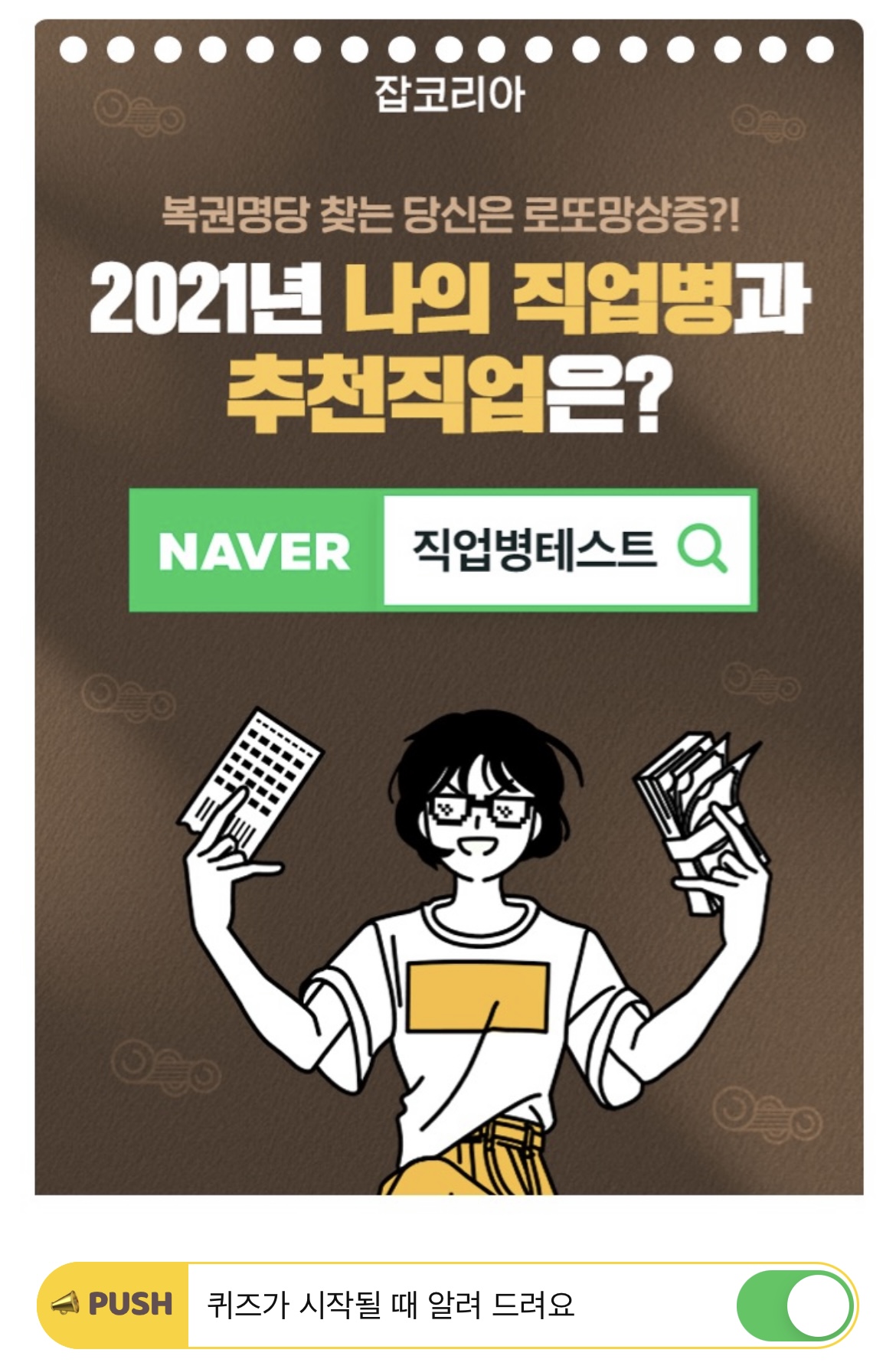 2021년 나의 직업병과 10년 후 추천직업을 소름돋게 처방해주는 OOOOOO가 대유행이라고 합니다. 30초면 결과가 바로 나오는데요. 빈칸에 들어갈 이 테스트 이름은 무엇일까요?