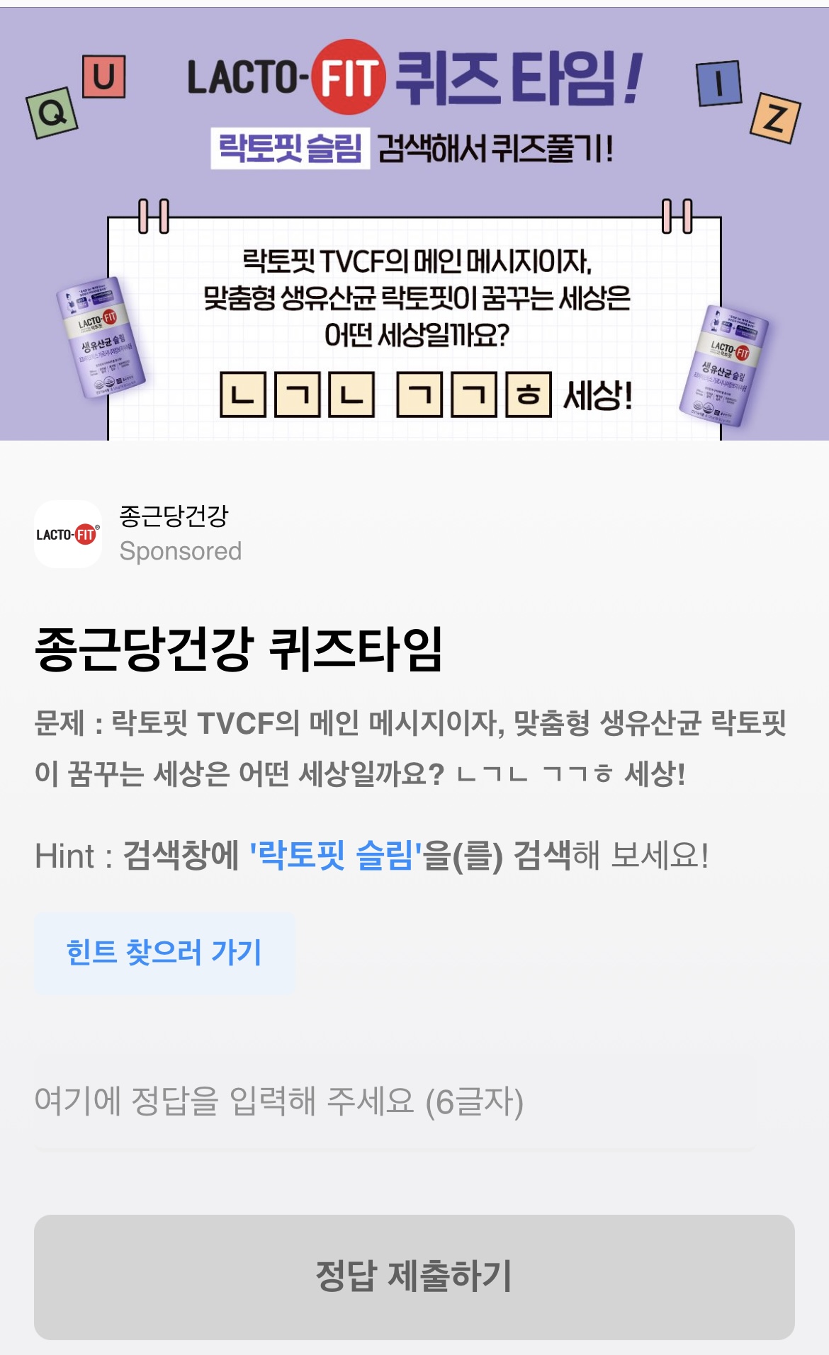 문제 : 락토핏 TVCF의 메인 메시지이자, 맞춤형 생유산균 락토핏이 꿈꾸는 세상은 어떤 세상일까요? ㄴㄱㄴ ㄱㄱㅎ 세상!