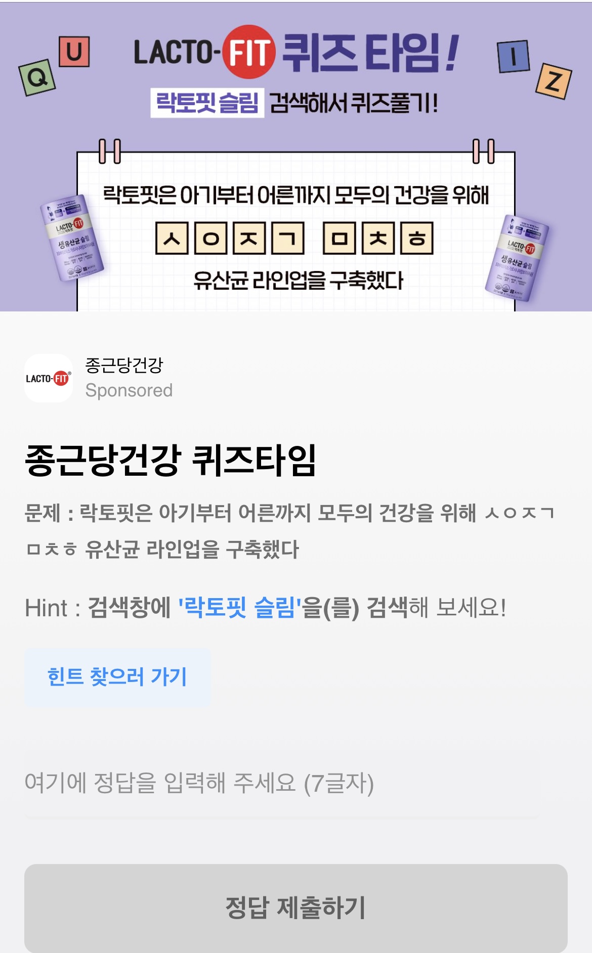 문제 : 락토핏 TVCF의 메인 메시지이자, 생애주기별 누구에게나 꼭 맞는 프로바이오틱스 락토핏이 꿈꾸는 세상은? 누구나 ㄱㄱㅎ ㅅㅅ!