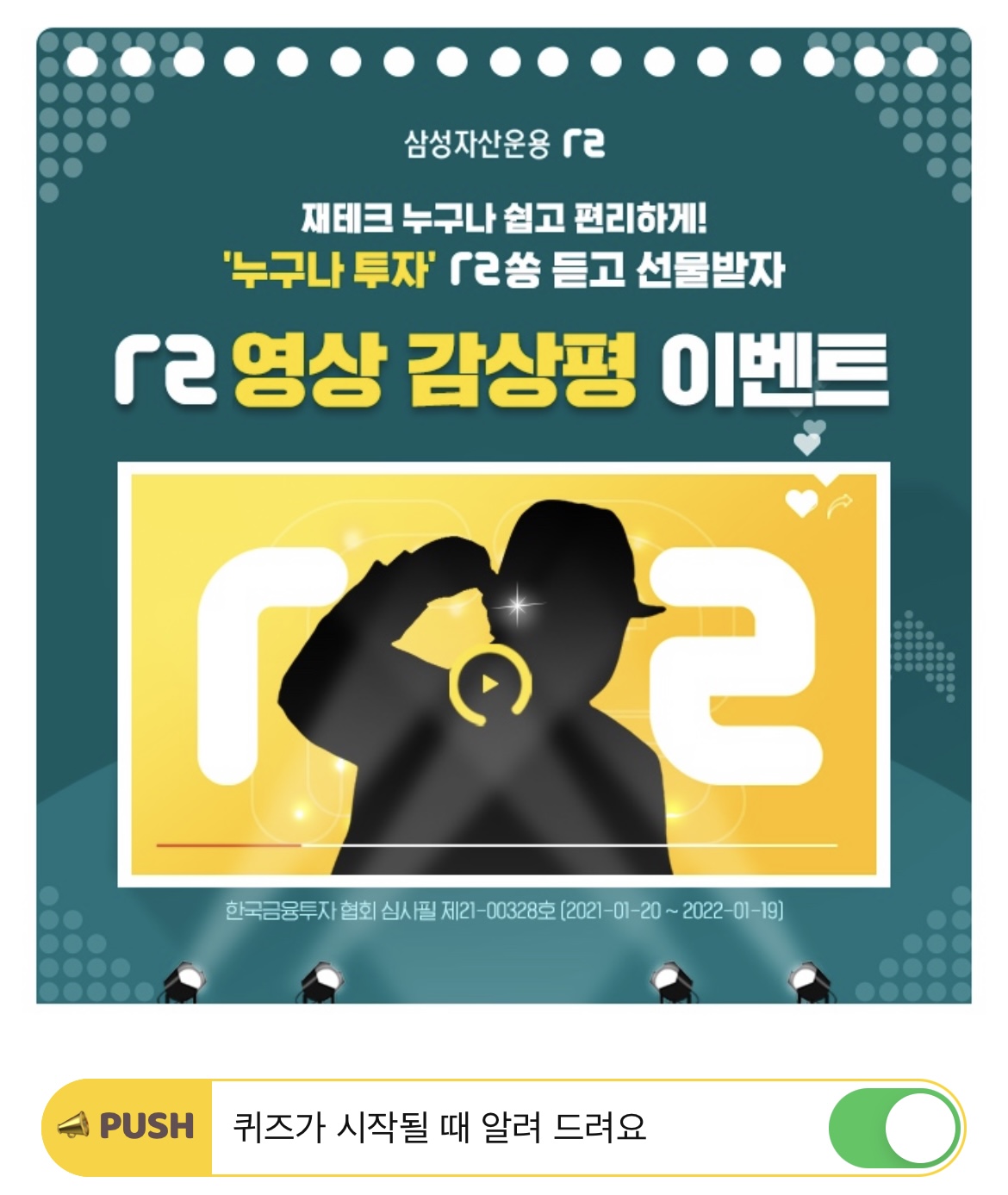 ‘누구나 투자’ 영상 속에서 홍잠언이 정착하게 된 펀드 플랫폼의 이름은 ‘모바일 펀드투자 OOO 플랫폼 삼성자산운용 R2’ 입니다. 빈칸에 들어갈 단어는 무엇일까요? (초성 힌트: ㅈㄱㄹ)