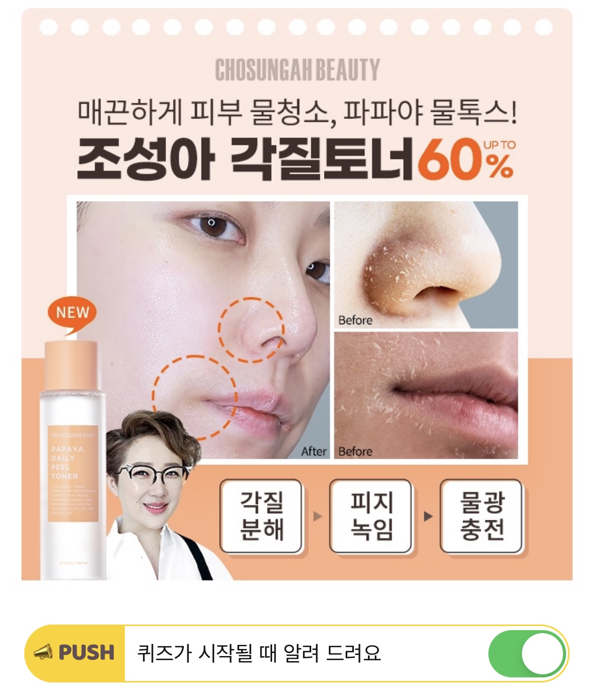 조성아 각질토너는 5가지 OO 핵심 성분을 함유하여 거칠어짐, 건조 등으로 손상된 피부 장벽 케어에 도움을 줍니다. OO에 들어갈 단어는 무엇일까요? (초성힌트: ㅅㅋ)