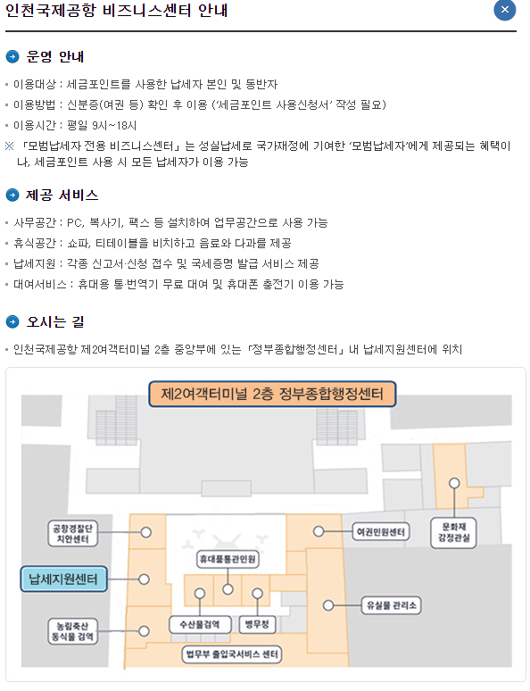 그중에 인천공항에 모범납세자 전용 비지니스센터도 이용할 수 있네요
