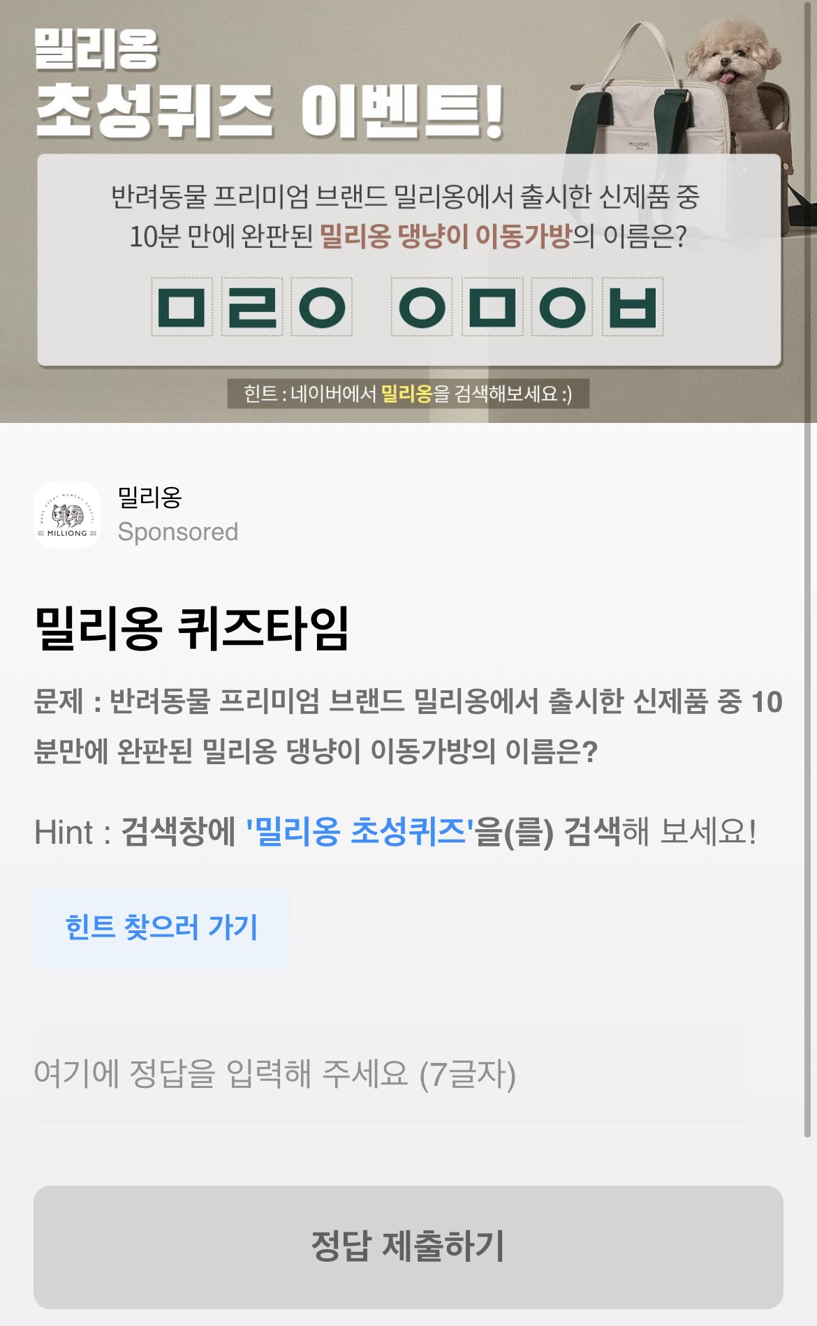 Hint : 검색창에 '밀리옹 초성퀴즈'을(를) 검색해 보세요!