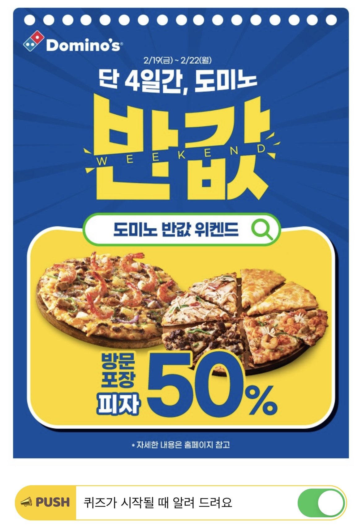 오늘부터 단 4일 동안 피자 포장 50% 할인되는 도미노 반값 위켄드 프로모션이 시작됩니다!