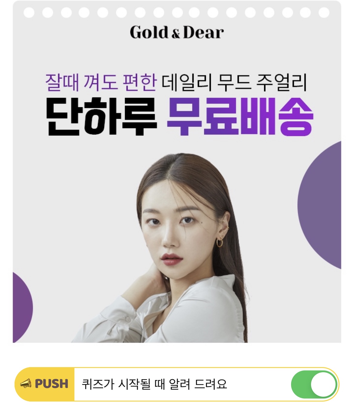 14K 귀걸이 브랜드 골드앤디어는 알레르기 걱정이 없어 잘때 껴도 편한 OOOOOO 데일리무드 주얼리 브랜드 입니다. 빈칸에 들어갈 단어는 무엇일까요? (힌트 : ㅅㅋㅍㄹㄷㄹ)