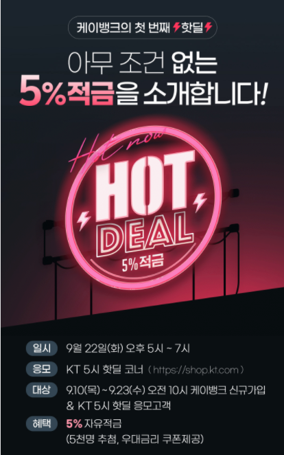 대상 : 9.10(목) ~ 9.23(수) 오전 10시에 케이 뱅크 신규가입을 하고 KT 5시 핫딜 응모 고객