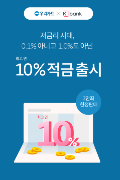 케이뱅크가 우리카드와 함께 만든 10% 적금! 놀라운 금리를 만나보세요.