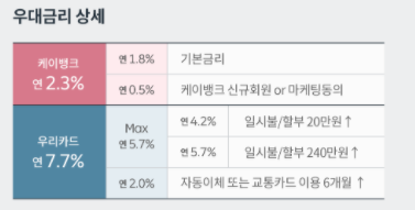 그래서 그런지 카드 우대금리 조건을 맞추려면 엄청 까다롭네요.