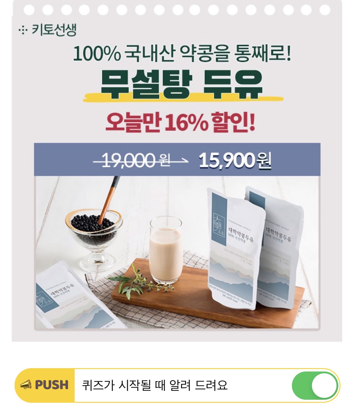 '설탕'과 '첨가물'을 전혀 넣지 않은 대학약콩두유의 당류는 일반 두유 대비 OO% 낮은 '1g'인데요. 이는 100% 국내산 약콩에서 나온 자연 당류로, 안심하고 먹을 수 있어 더욱 인기를 얻고 있습니다. 빈칸에 들어갈 숫자는 무엇