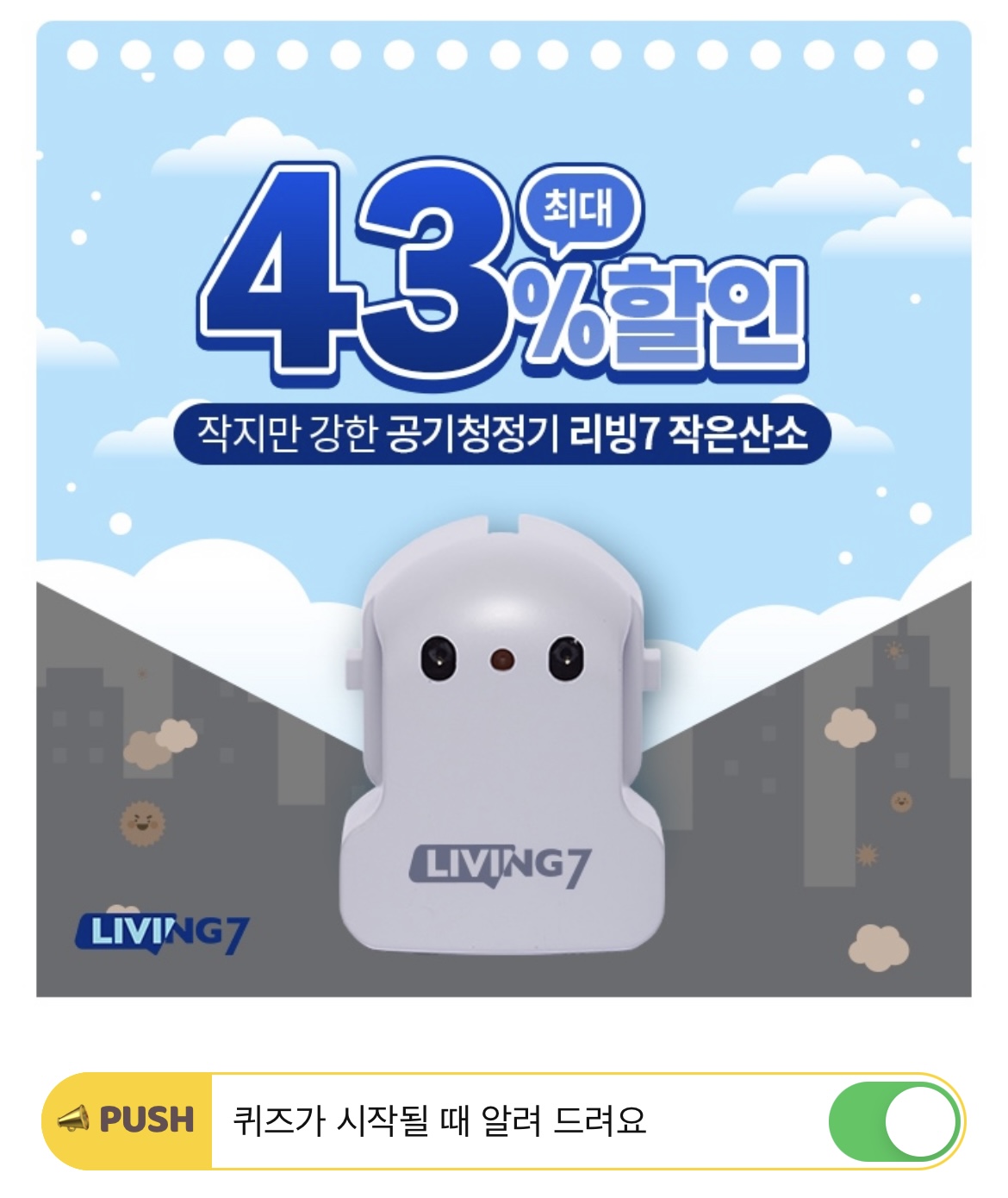 리빙7 작은산소는 사용이 편리한 OOO 음이온 공기 청정살균기이다. OOO에 들어갈 단어는 무엇일까요? (힌트 : ㅊㅅㅎ)