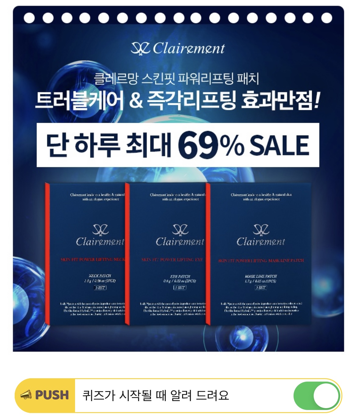 클레르망 스킨핏 파워리프팅 패치는 100% 화장품 성분 OO OO OO입니다. 친환경 시트로 사용 후 떼어낼 필요 없이 세안하여 녹여주면 피부 보습에 더 효과적입니다. 빈칸에 들어갈 단어는 무엇일까요? (힌트:ㅁㅇㄴㄴㅍㅊ)