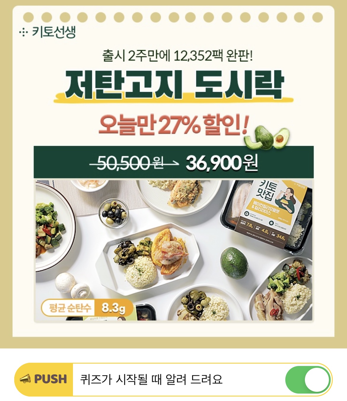 순탄수화물이란 탄수화물에서 식이섬유를 제외한 성분으로, 몸에 직접 흡수되어 살찌는 원인이 됩니다. 키토선생 도시락은 탄수화물이 낮고 식이섬유는 높은 '컬리플라워'로 쌀을 대체하여, 즉석밥대비 순탄수화물을 OO배 낮췄는데요. 9개월동안 연구한 키토선생만의 비법으로 컬리플라워의 아삭한 식감까지 살려 더욱 인기를 얻고 있습니다. 빈칸에 들어갈 숫자는 무엇일까요?