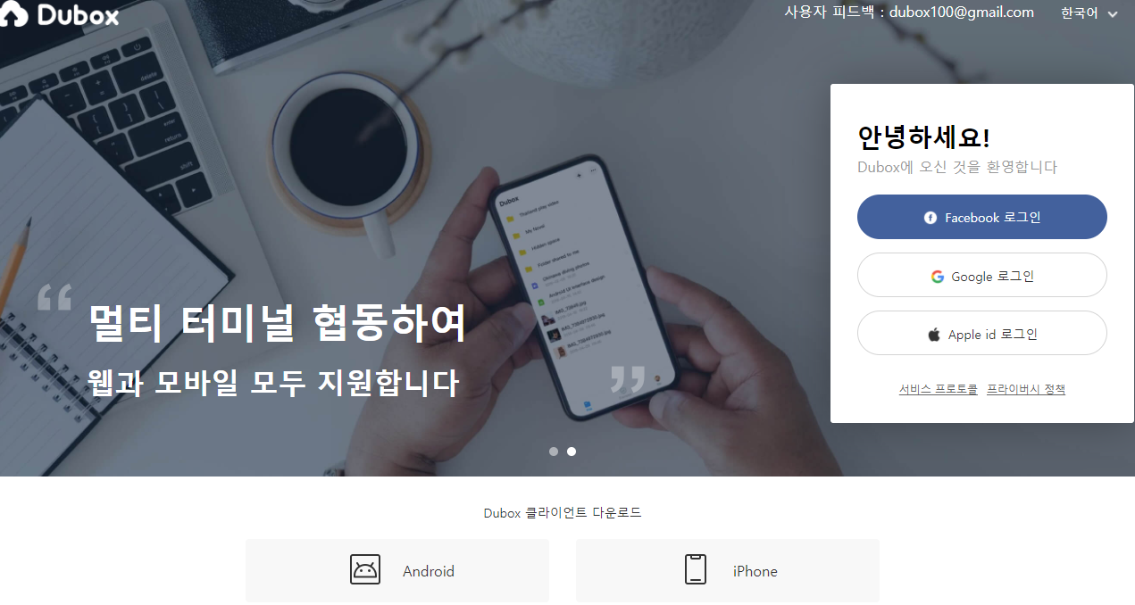 웹 기반으로 업로드, 다운로드가 가능하고 안드로이드, 아이폰 앱이 있어 휴대폰에서