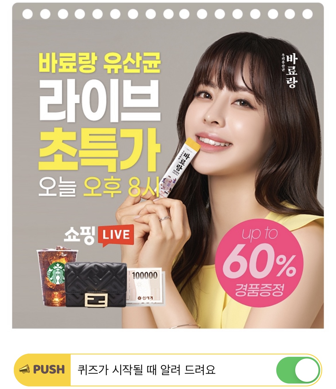 유산균 전문 브랜드인 바료랑은 OOO OOO를 직접 운영하며, 오늘 오후 8시 라이브 특가와 경품 이벤트까지 진행 중입니다.