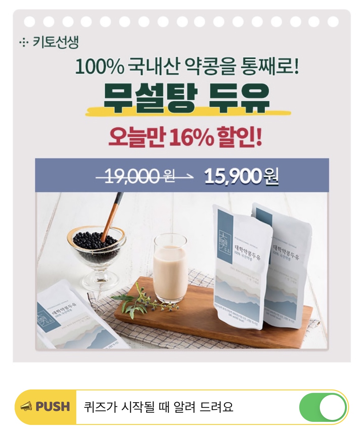 설탕과 첨가물을 넣지 않고 100% 국내산 약콩으로 만든 대학약콩두유의 당류는 일반두유 대비 OO% 낮은 1g밖에 되지 않아 당뇨환자나 아이들도 건강하게 즐길 수 있는데요. 빈칸에 들어갈 숫자는 무엇일까요?