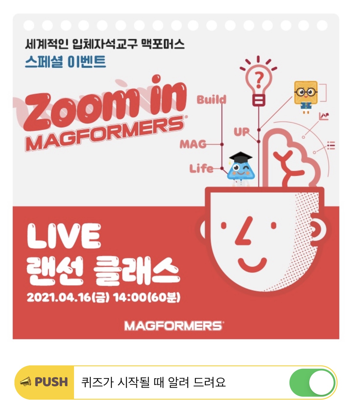3D 두뇌 트레이닝을 통해 입체적 사고를 돕는 글로벌 NO.1 에듀토이 맥포머스가 Build up OOOOOOO 캠페인을 준비, 첫 번째 프로모션인 'Zoom in MAGFORMERS’에서는 뇌 전문의 노규식 박사, 한국짐보리 교육연구소 김혜련 소장, 육남매 아빠 박지헌, MC김경화와 라이브 랜선 클래스를 진행합니다. (힌트: 영문)