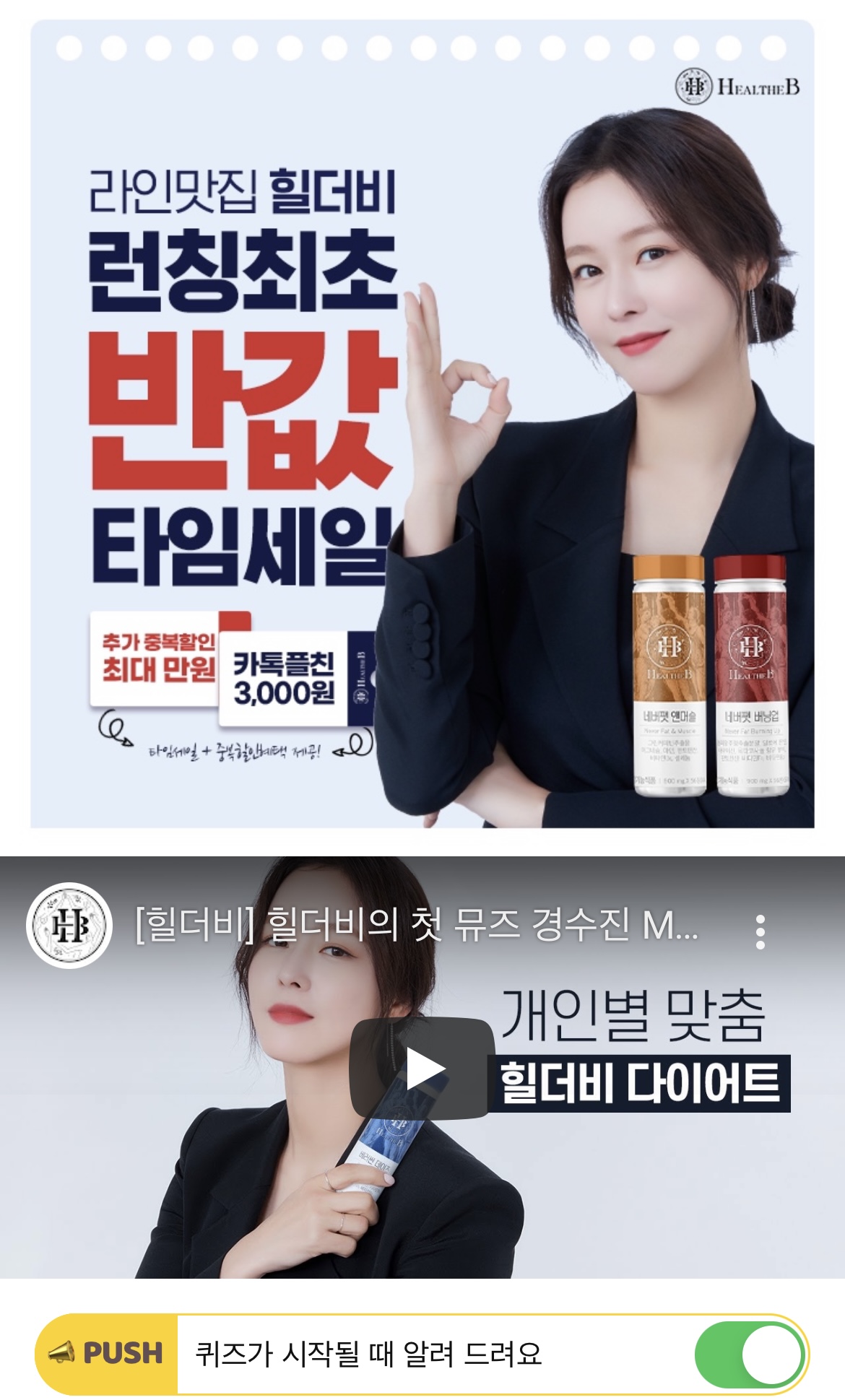 나혼산 경수진이 선택한 그 제품, 힐더비! 신규회원+카톡채널 쿠폰 중복할인 혜택 제공까지! 힐더비의 제품 중 하나인 '컷프로 더블핏'의 주요 기능성 성분인 'OOOOO' 은 항산화, 체지방감소, 혈중 콜레스테롤 개선에 도움을 줄 수 있습니다. 일상에서 차로 많이 마시는 이것에서 추출한 이 성분은 무엇일까요? (힌트: ㄴㅊㅊㅊㅁ)