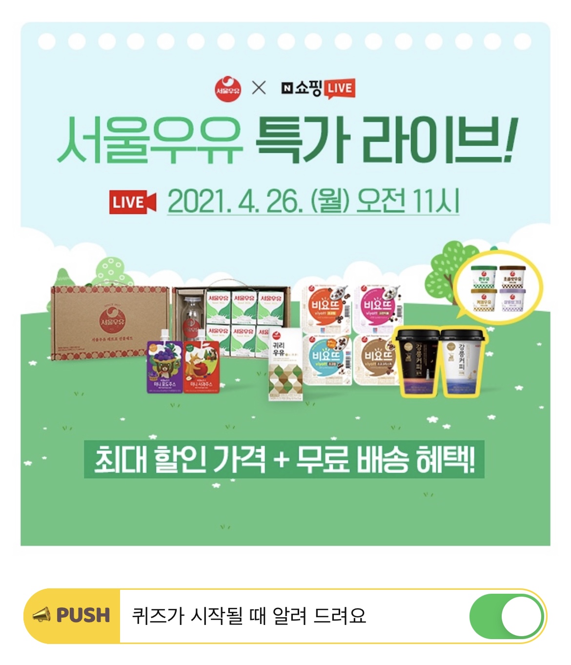 나100샵 서울우유에서 네이버 쇼핑라이브방송 기념 ! 최대 할인 가격 + 무료 배송 혜택으로 준비했습니다. 서울우유와 함께 이번 방송을 진행하는 개그맨 OOO님 방송 보고 캐쉬 받으세요.