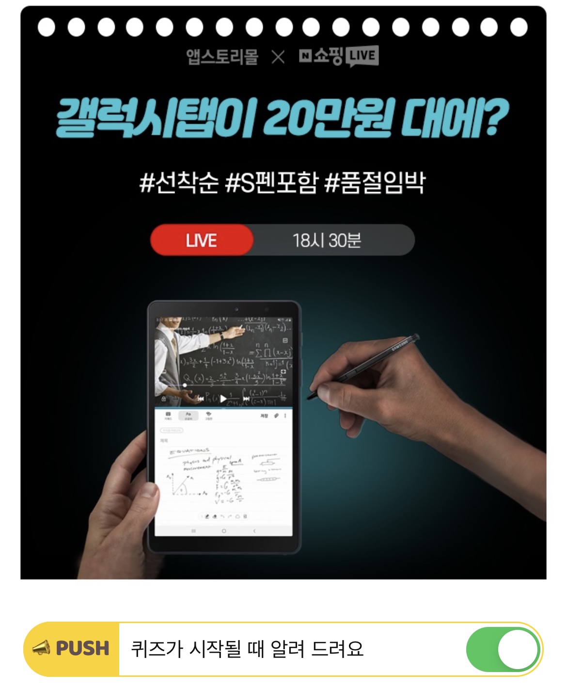 슬림 디자인과 S펜이 기본 탑재 된 작지만 뛰어난 성능을 가진 '삼성 갤럭시 탭A8.0 OOOO S펜'을 라이브 특가로 쏩니다! 오늘만 앱스토리몰에서 진행되는 국내 최저가 네이버 쇼핑 라이브 한정 특가를 놓치지 마세요. OOOO에 들어 갈 단어는 무엇일까요? (영문)