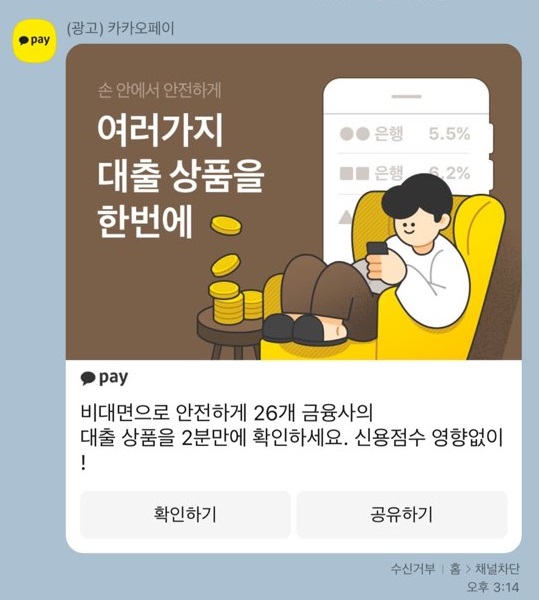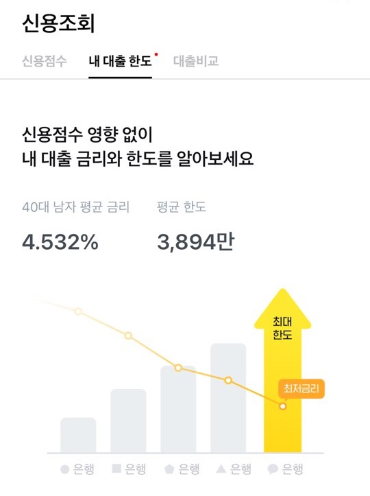 40대 평균 대출 금리가 어쩌고 평균 한도가 어떻고, 카카오 톡에서 한 번에 조회가 가능하다. 머 이런 소개글과 함께.