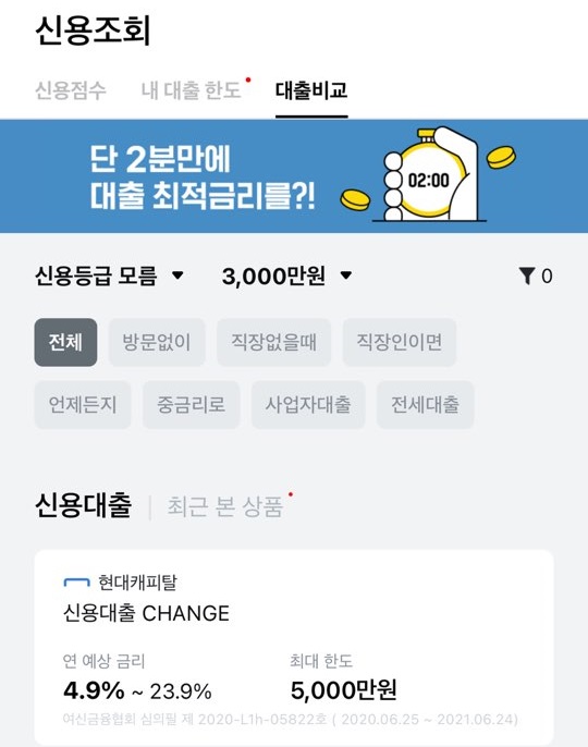 여러 대출 상품을 한번에 확인할 수 있는 것은 핀다라는 사이트만 있는 것으로 알고 있었는데, 대단하네요