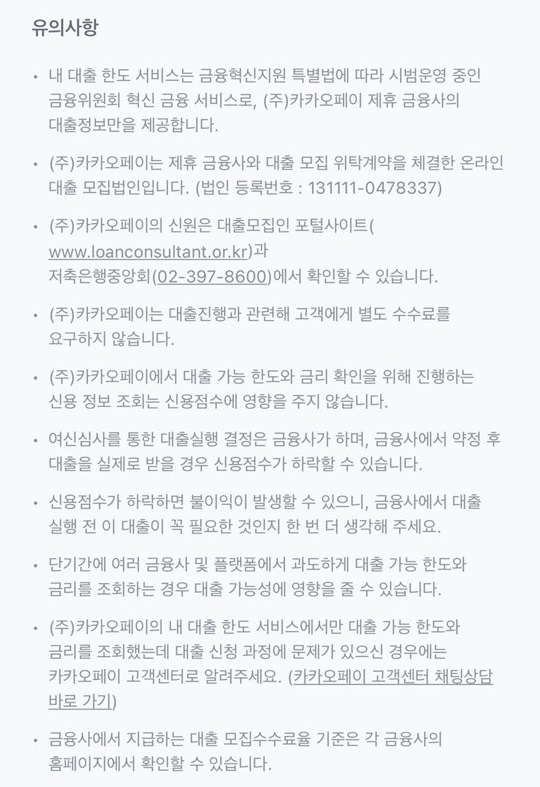 내 대출 한도 서비스는 금융혁신지원 특별법에 따라 시범운영 중인 금융위원회 혁신 금융 서비스로, (주)카카오페이 제휴 금융사의 대출정보만을 제공합니다.