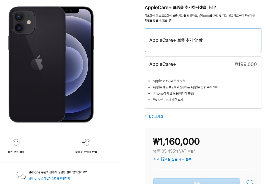 애플에서는 금액은 109만원으로 동일한데 카드혜택이나 그런것이 없네요