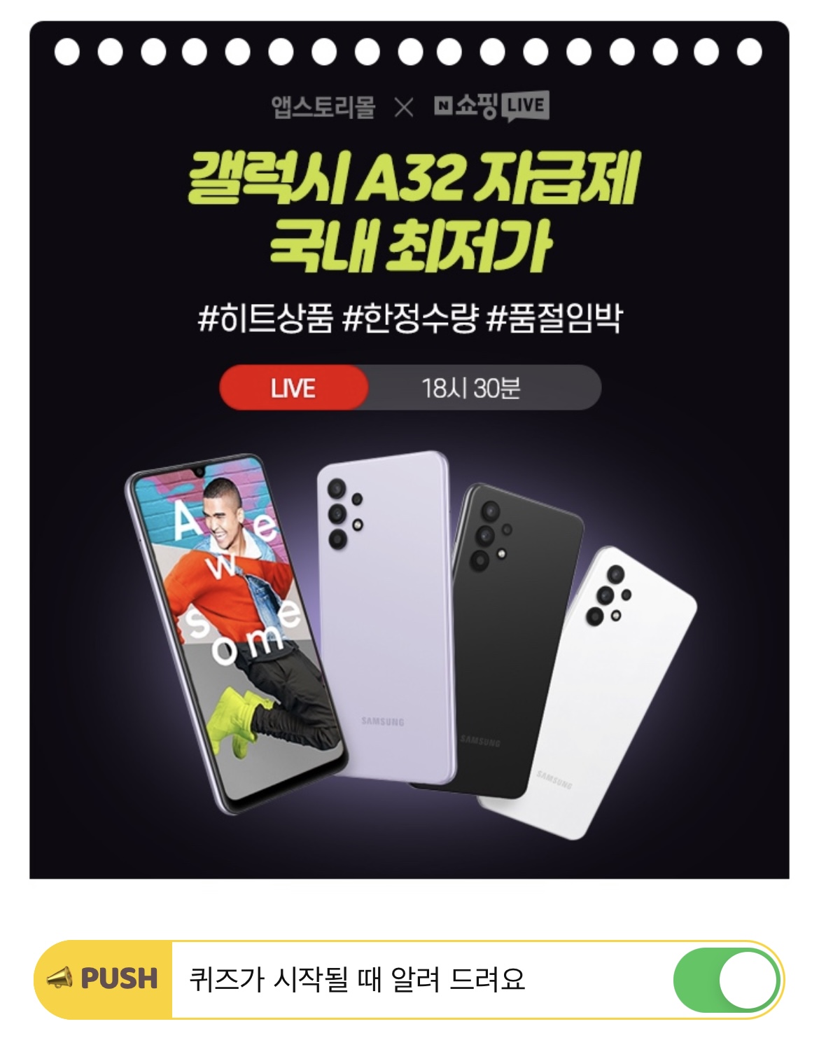 고해상도 카메라와 아몰레드 디스플레이, 대용량 배터리까지! 라이브 특가로 국내 최저가 OOO 삼성 갤럭시 A32 자급제를 쏩니다! 오늘만 앱스토리몰에서 진행되는 네이브 쇼핑 라이브 한정 특가를 놓치지 마세요. OOO에 들어 갈 단어는 무엇일까요? (초성힌트 : ㄱㅅㅂ)