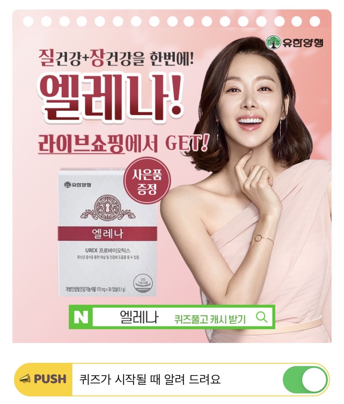여성의 질 건강과 장 건강을 케어하는 프리미엄 OOOOO 엘레나. 빈칸에 들어간 단어는 무엇일까요? (초성힌트: ㅁㅌㅇㅅㄱ)