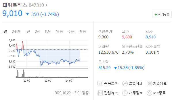 예를들어 오늘자로 파워로직스 주가는 9010원이네요