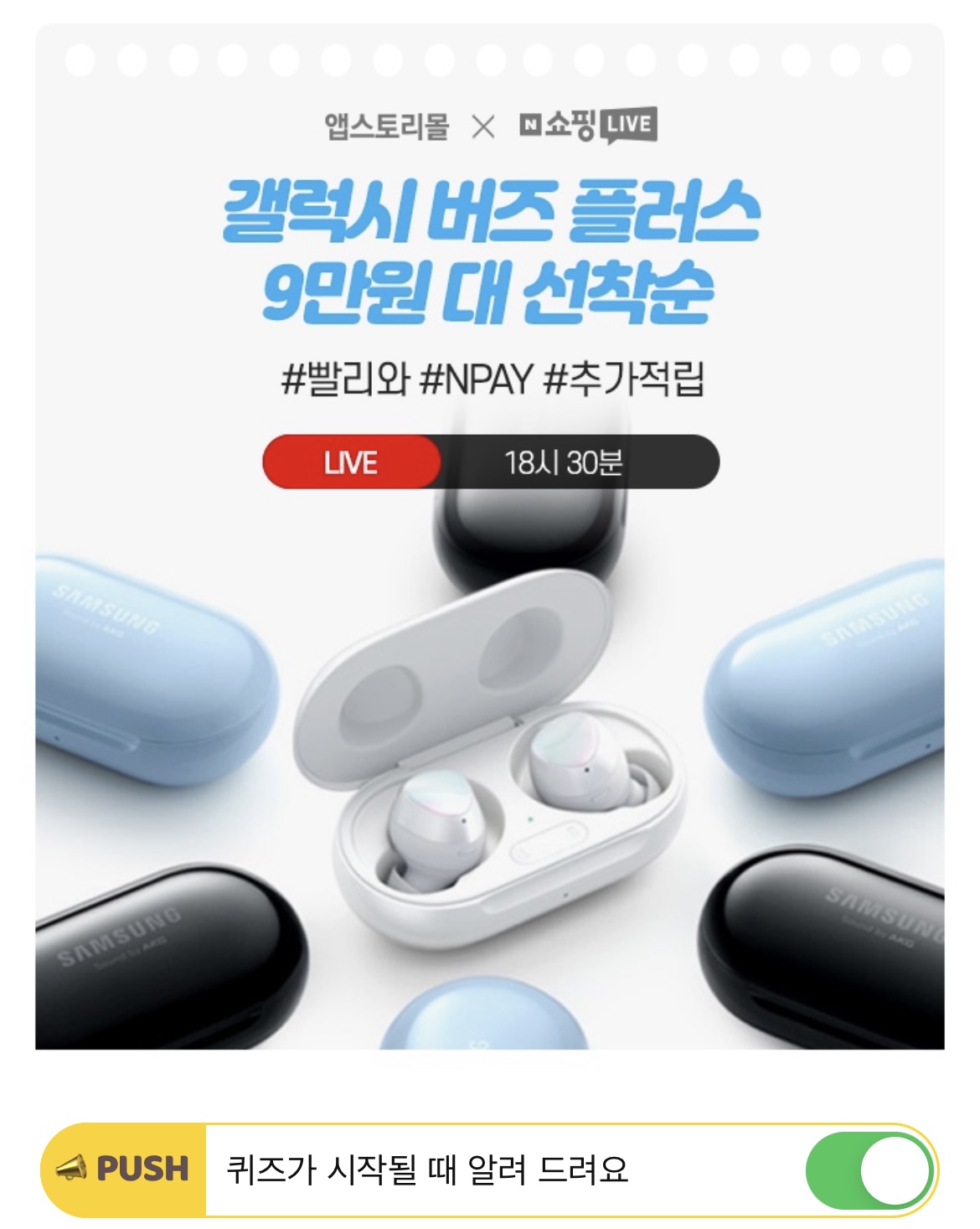 풍성하고 선명한 OOO 고음질 '삼성 갤럭시 버즈 플러스'를 라이브 특가로 쏩니다! 오늘만 앱스토리몰에서 제공하는 이벤트와 국내 최저가 네이버 쇼핑 라이브 한정 특가를 놓치지 마세요. OOO에 들어 갈 영어 단어는 무엇일까요?