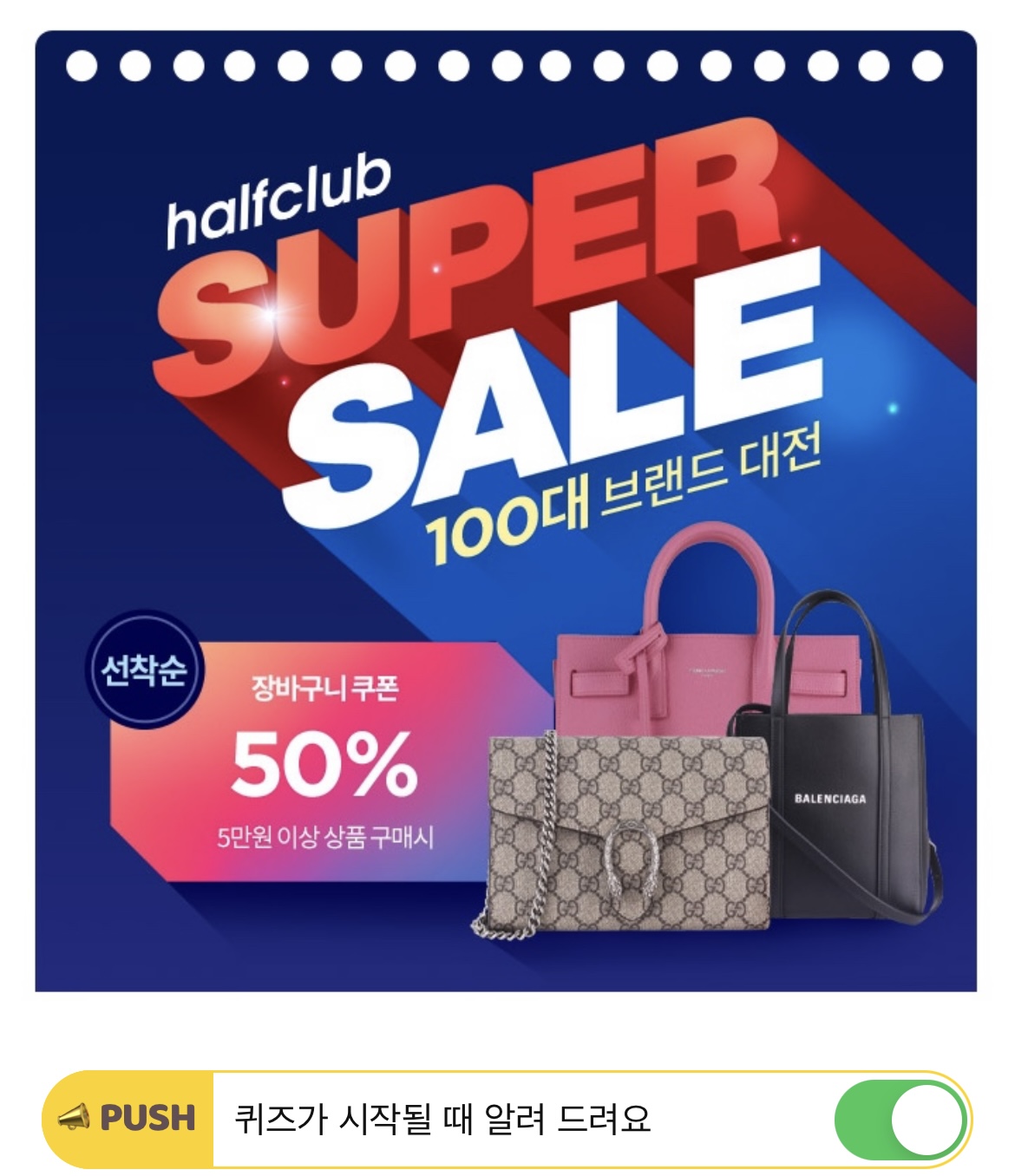 하프클럽 슈퍼세일 할인전에서는 최대 3만원 할인가능한 15% OO쿠폰을 증정합니다. 여기서 OO에 들어갈 단어는 무엇일까요? (힌트 : ㅈㅂ)