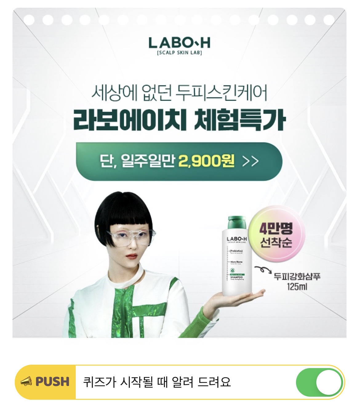 지금 라보에이치 공식몰에서 2,900원 체험특가 이벤트 중인 제품 OOOOOO는 6주만에 빠지는 모발 수 67.6% 감소 효과는 물론, 비건인증·고객 안전 안심 5관왕· 화해 1위를 받아 안전성부터 고객만족까지 믿을 수 있는 두피스킨케어 제품입니다. 지금 2,900원에 구매할 수 있는 이 제품의 이름은 무엇일까요?